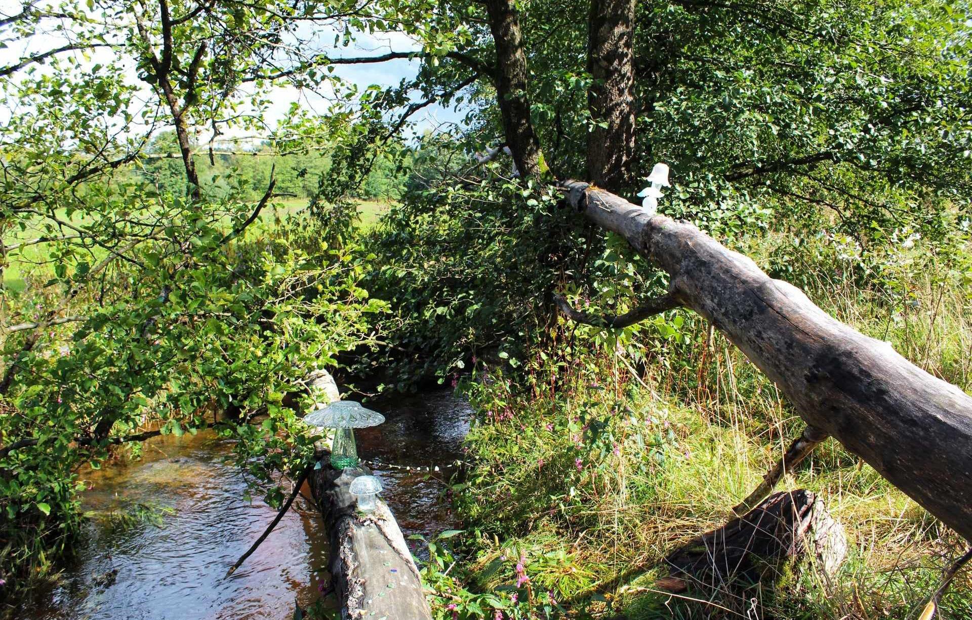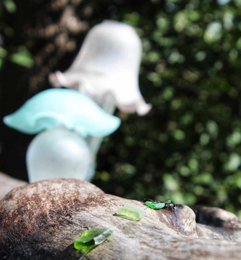 Conception and realization of a land art project in Schönsee. Part of an international student exhibition on the theme of water, highlighting the rivers and streams flowing between the Czech Republic and Germany. We wanted to evoke the birth of life thanks to water, through garlands of polished glass circulating among tree stumps, revealing mushrooms made from recycled glass.