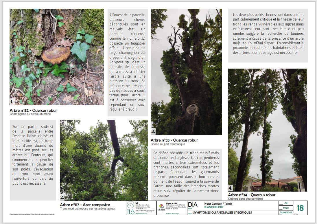 The mission consisted in establishing a visual diagnosis of the trees in the former park of the Château de Cambon in Blanquefort. The aim was to determine the number trees, their location and quality, as well as their physiological and health status. The aim was dual: to establish areas in which building would have the least impact, and to identify trees in need of intervention in order to open up the park to public.