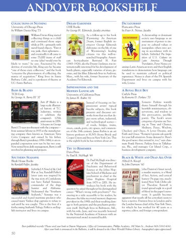 William Davies King started collecting things as a child and continued those urges while at PA—primarily with metal found objects. ”First it was junk, then ephemera… and eventually it all came to some 75,000 items of stuff no one (else) would ever be likely to want,” he says. Fascinated by the detritus of everyday life, King says he became “one of those crazy collectors,” and the book “concerns the phenomenon of collecting, the mania of acquisition.” King lives in Santa Barbara, Calif., and is a professor of theatre at UC–Santa Barbara.