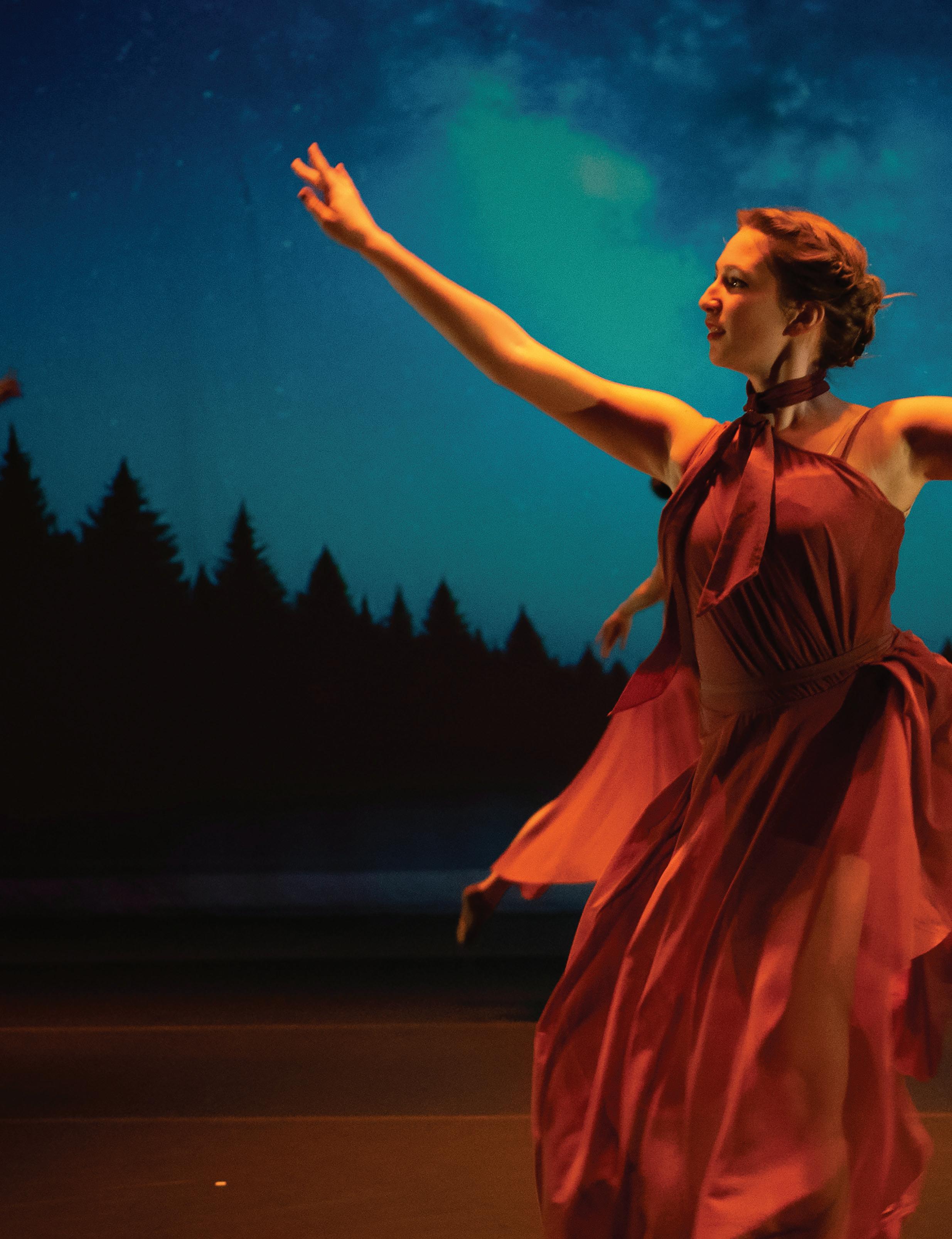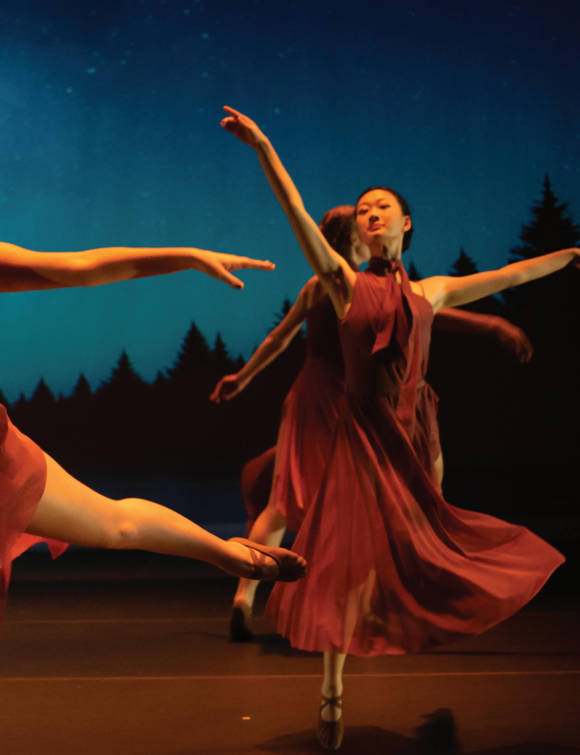 Dancers perform Sylvia Reclaimed, an original ballet conceived and choreographed by instructor in theatre and dance Kareem J. Lewis. The production reimagines the classic mythic ballet blending classical form with contemporary storytelling. Lewis’s two-act work transforms an 1876 score by Léo Delibes into a vivid world of huntresses, forest spirits, and constellations embodying power and renewal.