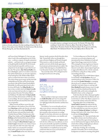 Dear class, Was it my failure to show up to reunion (I told you, Kelly Elworthy and I were becoming ASAcertified sailors!) that caused everyone to be even more tight-lipped about the festivities and their lives than usual? Nevertheless, I see on social media and every other vector of news conveyance that your lives and budding families are positively blooming. Just remember what our parents are reading, though. Do it for them, and write to me about your achievements and adventures, your stumbles and your perseverance. Luckily for us all, Takashi “T.K.” Ikeda decided to be the hero of this issue. In an ultimate act of non sibi in action, he kindly responded to my birthday pleas for news from our dear classmates by writing, “I don’t think I’ve ever updated you on my status (aside from what you can see on Facebook), so here goes on my current life!