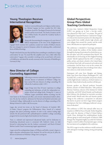 Global Perspectives Group Plans Global Teaching Conference At press time, Andover’s Global Perspectives Group (GPG) was gearing up to host a two-day conference planned for May 6 and 7 on campus. The goal of “Sharing Best Classroom Practices: Contexts for Change” is to discuss best classroom practices for educating teens using models from middle schools, high schools, and even colleges from around the country and the world. Some 100 educators are expected to participate. The conference is intended to “encourage participants to think outside the confines of their familiar context through the sharing of innovations by schools that are unlike each other,” says GPG coordinator Peter Merrill. “We intentionally are not focusing on New England boarding schools.” Merrill explained that the GPG is looking to public, private, and charter schools in the United States and abroad, from both well resourced and underserved communities. And the focus is not on the content, the “what” of global education, but on looking at how education is done in a wide variety of contexts. Participants will come from Shanghai and Beijing; India; Cape Town; New Orleans; Washington, D.C.; and Scarsdale, N.Y., as well as local public and private schools, and the Eight Schools Conference, of which Andover is a member. Many Andover faculty members will take part. Keynote speakers are Harvard professor Fernando Reimers, director of Global Education; Tufts professor Sherman Teichman, director of the Institute for Global Leadership; and LEAP School founder and headmaster John Gilmour, who developed an innovative secondary school model. Merrill notes that each keynote speaker “brings to the conference a perspective on education that derives its power not from ‘magic button’ program development, but from challenging traditional conceptions of education.” This conference is GPG’s first outreach effort since its inception in 2006 by Dean of Faculty Temba Maqubela, who, under the direction of Head of School Barbara Landis Chase, developed the multidisciplinary faculty advisory group to work toward goals of Andover’s 2004 Strategic Plan. Maqubela’s highly successful ACE Scholars Program, created to address the preparation gap, is among the innovations to be spotlighted at the conference. The GPG is eager to see this conference model continued with subsequent meetings rotating among participating schools.