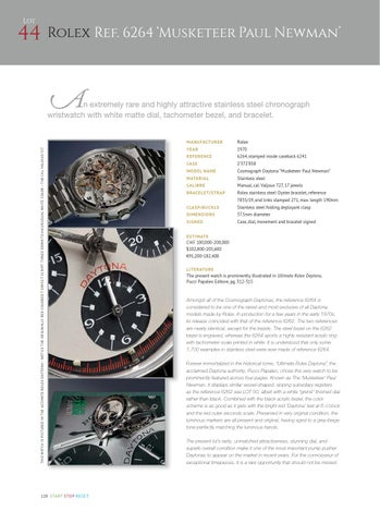 Amongst all of the Cosmograph Daytonas, the reference 6264 is considered to be one of the rarest and most exclusive of all Daytona models made by Rolex. In production for a few years in the early 1970s, its release coincided with that of the reference 6262. The two references are nearly identical, except for the bezels. The steel bezel on the 6262 bezel is engraved, whereas the 6264 sports a highly resistant acrylic ring with tachometer scale printed in white. It is understood that only some 1,700 examples in stainless steel were ever made of reference 6264. Forever immortalized in the historical tome, “Ultimate Rolex Daytona”, the acclaimed Daytona authority, Pucci Papaleo, chose this very watch to be prominently featured across four pages. Known as The ‘Musketeer’ Paul Newman, it displays similar vessel-shaped, sloping subsidiary registers as the reference 6262 see LOT 50, albeit with a white “grené” finished dial rather than black. Combined with the black acrylic bezel, the color scheme is as good as it gets with the bright red ‘Daytona’ text at 6 o’clock and the red outer seconds scale. Preserved in very original condition, the luminous markers are all present and original, having aged to a grey-beige tone perfectly matching the luminous hands. The present lot’s rarity, unmatched attractiveness, stunning dial, and superb overall condition make it one of the most important pump pusher Daytonas to appear on the market in recent years. For the connoisseur of exceptional timepieces, it is a rare opportunity that should not be missed.