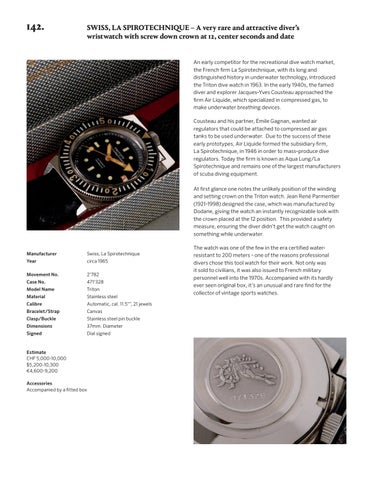 An early competitor for the recreational dive watch market, the French frm La Spirotechnique, with its long and distinguished history in underwater technology, introduced the Triton dive watch in 1963. In the early 1940s, the famed diver and explorer Jacques-Yves Cousteau approached the frm Air Liquide, which specialized in compressed gas, to make underwater breathing devices. Cousteau and his partner, Émile Gagnan, wanted air regulators that could be attached to compressed air gas tanks to be used underwater. Due to the success of these early prototypes, Air Liquide formed the subsidiary frm, La Spirotechnique, in 1946 in order to mass-produce dive regulators. Today the frm is known as Aqua Lung/La Spirotechnique and remains one of the largest manufacturers of scuba diving equipment. At frst glance one notes the unlikely position of the winding and setting crown on the Triton watch. Jean René Parmentier (1921-1998) designed the case, which was manufactured by Dodane, giving the watch an instantly recognizable look with the crown placed at the 12 position. This provided a safety measure, ensuring the diver didn’t get the watch caught on something while underwater.