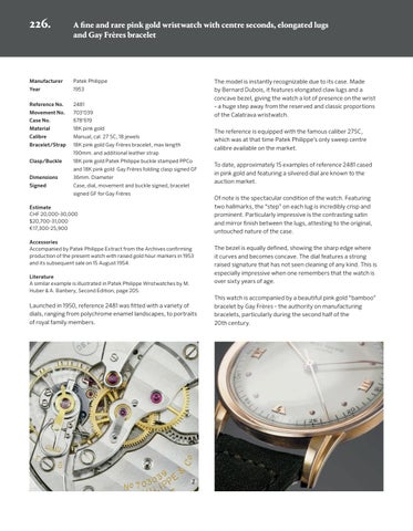 The model is instantly recognizable due to its case. Made by Bernard Dubois, it features elongated claw lugs and a concave bezel, giving the watch a lot of presence on the wrist - a huge step away from the reserved and classic proportions of the Calatrava wristwatch. The reference is equipped with the famous caliber 27SC, which was at that time Patek Philippe’s only sweep centre calibre available on the market. To date, approximately 15 examples of reference 2481 cased in pink gold and featuring a silvered dial are known to the auction market. Of note is the spectacular condition of the watch. Featuring two hallmarks, the “step” on each lug is incredibly crisp and prominent. Particularly impressive is the contrasting satin and mirror fnish between the lugs, attesting to the original, untouched nature of the case. The bezel is equally defned, showing the sharp edge where it curves and becomes concave. The dial features a strong raised signature that has not seen cleaning of any kind. This is especially impressive when one remembers that the watch is over sixty years of age. This watch is accompanied by a beautiful pink gold “bamboo” bracelet by Gay Frères - the authority on manufacturing bracelets, particularly during the second half of the 20th century.