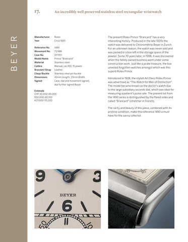 The present Rolex Prince “Brancard” has a very interesting history. Produced in the late 1920s the watch was delivered to Chronométrie Beyer in Zurich. For an unknown reason, the watch was never sold and was packed in a box lef in the storage space of the jeweler. Some 70 years later, in 1998, it was discovered when the family owned business went under some construction work. Just like a pirate treasure, the box unveiled forgotten watches amongst which was this superb Rolex Prince. Introduced in 1928, the stylish Art Deco Rolex Prince was advertised as “The Watch for Men of Distinction”. The model became known as the doctor’s watch due to the large subsidiary seconds dial, which was ideal for measuring a patient’s pulse rate. The present lot from the 1490 series is distinguished by the fared sides and called “Brancard” (stretcher in French). The rarity and beauty of this piece, combined with its pristine condition, make this reference 1490 a must have for the savvy collector.