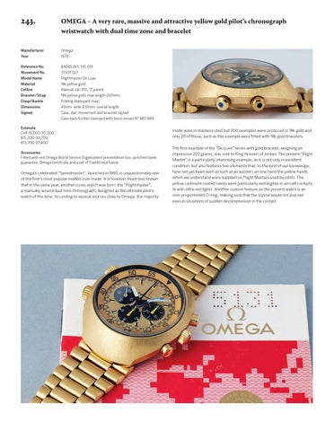 made were in stainless steel but 200 examples were produced in 18k gold and only 20 of those, such as this example were fitted with 18k gold bracelets. The first example of the “De Luxe” series with gold bracelet, weighing an impressive 220 grams, was sold to King Hussein of Jordan. The present “Flight Master” is a particularly interesting example, as it is not only in excellent condition, but also features two elements that, to the best of our knowledge, have not yet been seen as such at an auction; on one hand the yellow hands which we understand were supplied on Flight Masters used by pilots. The yellow cadmium coated hands were particularly well legible in aircraft cockpits lit with infra-red lights. Another custom feature on the present watch is an over proportioned O-ring, making sure that the crystal would not pop out even in situations of sudden decompression in the cockpit.