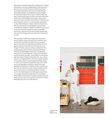 Rigorously structured to play with our perception of depth, Wood shows a profound indebtedness to Paul Cézanne’s deconstruction of pictorial space and the fracturing of forms that manifested in the Cubism of Pablo Picasso and Georges Braque. He modifes the visual strategies of modern painting to refect a post-modern reality; one that is infltrated by fatness of the screen and a saturated visual culture fed by digital technologies. With further references to the consumer brand worship of Andy Warhol and the graphic interest in corporate logos expounded by Jean-Michel Basquiat, Wood condenses the abstract, the representational, the photographic and televised. In the absence of players, referees or audience, this surreal tennis court becomes a geometric game, revelling in asymmetry, where form and colour provide the dynamic back and forth energy otherwise expressed in the heat of a match. Having initially studied psychology before focusing on fne art, Wood’s unique interweaving of aesthetics and memory have earned his quotidian scenes a revered place in the history of contemporary painting. The artist gained notoriety in his early career through personal images of friends, family and interiors all based on frst hand perception and memories. Wood has remarked: ‘Of all the possible things I could paint, the thing that interests me is something that I can get close enough to in order to paint it honestly.’ (Jonas Wood in conversation with Ana Vejzovic Sharp in: Dan Nadel, Ed., Jonas Wood: Interiors, Los Angeles 2012, p. 56.) As a crucial innovation in his practice, Wood’s sports images specifcally relate to visions and memories mediated through other media such as photography or television. Wood’s frst sport paintings used portraits of athletes that he sourced from the cards he collected as a child. Whilst familiar to some and surreal to others, the fattening efect of the blue court in Australian Open Two evokes space experienced as an image mediated through television. But despite presenting a scene rooted in a widely accessible record of reality, Wood’s askew framing of the composition remains both highly personal and coolly abstract.
