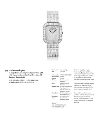 915. Audemars Piguet A magnifcent and exceptionally rare white gold with baguette diamond-set bracelet watch with baguette diamond dial 愛彼,瑰麗華美及非常罕有,18K白金鑲鑽鏈帶腕錶, 配滿鑽錶盤鑽石總重約21克拉,約2005年製