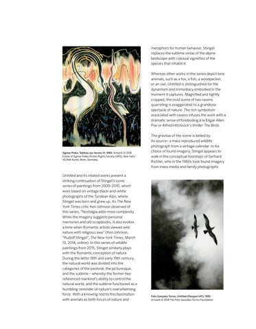 metaphors for human behavior, Stingel replaces the sublime vistas of the alpine landscape with colossal vignettes of the species that inhabit it. Whereas other works in the series depict lone animals, such as a fox, a fsh, a woodpecker, or an owl, Untitled is distinguished for the dynamism and immediacy embodied in the moment it captures. Magnifed and tightly cropped, the vivid scene of two ravens quarreling is exaggerated to a grandiose spectacle of nature. The rich symbolism associated with ravens infuses the work with a dramatic sense of foreboding à la Edgar Allen Poe or Alfred Hitchcock’s thriller The Birds.