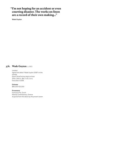 Untitled signed and dated “Wade Guyton 2008” on the overlap Epson UltraChrome inkjet on linen 34 1/8 x 24 1/8 in. (86.7 x 61.3 cm.) Executed in 2008. Estimate $80,000-120,000 Provenance Francesca Pia, Zurich Ribordy Contemporary, Geneva Acquired from the above by the present owner