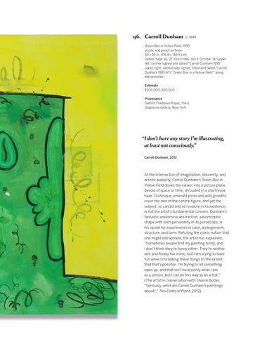 Green Box in Yellow Field, 1995 acrylic and pencil on linen 46 x 59 in. (116.8 x 149.9 cm) Dated “Sept 26, 27 Oct 2 1995 Oct 3 October 13” upper left; further signed and dated “Carroll Dunham 1995” upper right; additionally signed, titled and dated “Carroll Dunham 1995 NYC ‘Green Box in a Yellow Field’” along the stretcher. Estimate $200,000-300,000 Provenance Galerie Thaddeus Ropac, Paris Gladstone Gallery, New York