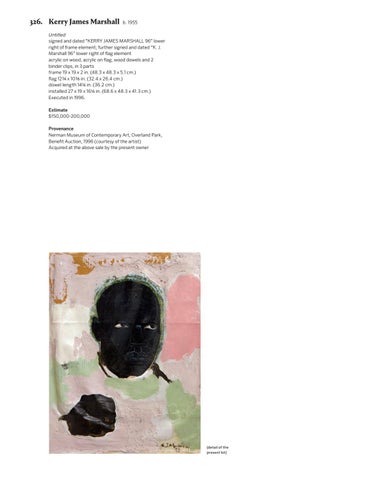 Untitled signed and dated “KERRY JAMES MARSHALL 96” lower right of frame element; further signed and dated “K. J. Marshall 96” lower right of fag element acrylic on wood, acrylic on fag, wood dowels and 2 binder clips, in 3 parts frame 19 x 19 x 2 in. (48.3 x 48.3 x 5.1 cm.) fag 12 3/4 x 10 3/8 in. (32.4 x 26.4 cm.) dowel length 14 1/4 in. (36.2 cm.) installed 27 x 19 x 16 1/4 in. (68.6 x 48.3 x 41.3 cm.) Executed in 1996. Estimate $150,000-200,000 Provenance Nerman Museum of Contemporary Art, Overland Park, Beneft Auction, 1996 (courtesy of the artist) Acquired at the above sale by the present owner