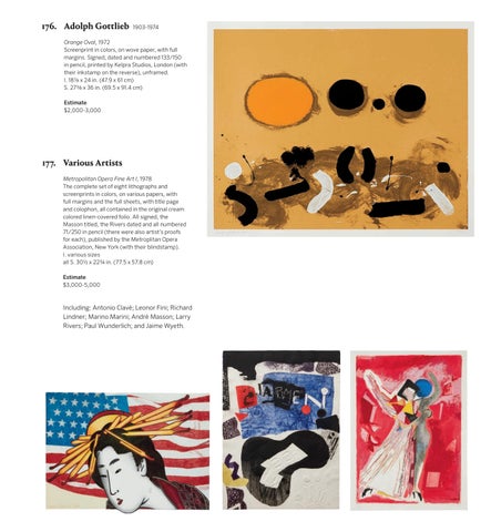 177. Various Artists Metropolitan Opera Fine Art I, 1978 The complete set of eight lithographs and screenprints in colors, on various papers, with full margins and the full sheets, with title page and colophon, all contained in the original cream colored linen-covered folio. All signed, the Masson titled, the Rivers dated and all numbered 71/250 in pencil (there were also artist’s proofs for each), published by the Metroplitan Opera Association, New York (with their blindstamp). I. various sizes all S. 30 1/2 x 22 3/4 in. (77.5 x 57.8 cm) Estimate $3,000-5,000