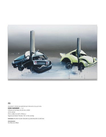 86 PROPERTY FROM AN IMPORTANT PRIVATE COLLECTION Dirk Skreber b. 1961 It Rocks Us So Hard, Ho Ho Ho 3, 2002 oil on canvas 170.2 x 280.2 cm (67 x 110 3/8 in.) Signed and dated ‘Skreber ‘02’ on the overlap. Estimate £10,000-15,000 $14,900-22,300 €14,000-21,000 ♠ † provenance Gio Marconi, Milan