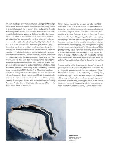 When Dumas created the present work for her 1988 exhibition at the Kunsthalle zu Kiel, she had established herself as one of the leading post-conceptual painters in Europe alongside artists such as René Daniëls, Erik Andriesse and Luc Tuymans. It was in 1985 that Dumas triumphantly returned to painting afer a fve-year hiatus, developing a complex approach to fgurative painting that took as a starting point her visual archive of art historical reproductions, news clippings, and photographic imagery. While Dumas based Waiting (For Meaning) on a 1970s photograph by David Hamilton depicting a female nude outstretched languorously on a bed, for the present work she took as a point of departure an image of a woman snorkeling from a thrif store nudist magazine, which her gallerist Paul Andriesse had gifed to Dumas for her archive. Transformative rather than mimetic, Dumas’s process of painting exploits the physicality of paint to undermine the photographic source material. Like her predecessor Edvard Munch, Dumas relishes in the materiality of painting; here, she liberally layers paint to evoke the depth and darkness of the sea, while simultaneously covering the ground with loose brushstrokes, allowing for areas of the canvas to remain exposed. ‘I especially admire in Munch that each brushstroke can be traced,’ Dumas has written.