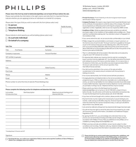 • Please submit your bids to the Bid Department by email to bidslondon@phillips.com or by fax at +44 20 7318 4035 at least 24 hours before the sale. You will receive confrmation by email within one business day. To reach the Bid Department by phone please call +44 20 7318 4045. • If you have not bid and bought with us before, please provide a bank reference • Payment for lots must be made by the invoiced party in pound sterling by wire transfer, credit card (up to £30,000) using Visa, American Express, Mastercard or Union Pay (Union Pay for in person transactions only), or cash (up to £5,000 for all purchases in any calendar year). • Lots cannot be collected until payment has cleared and all charges have been paid. • You will not have the right to cancel the sale of any lot purchased by you under the Consumer Contracts (Information, Cancellation and Additional Charges) Regulations 2013. • By signing this Bid Form, you acknowledge and understand that we may process your personal data (including potentially special category data) in accordance with Phillips’s Privacy Policy as published at www.phillips.com or available by emailing dataprotection@phillips.com. • Phillip’s premises and sale and exhibition venues may be subject to video surveillance and recording. Telephone calls (e.g. telephone bidding) may also be recorded. We may process that information in accordance with our Privacy Policy.