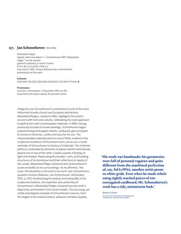 Modulated ridges signed, titled and dated ‘J. J. Schoonhoven 1965 “Modulated ridges”’ on the reverse painted cardboard, in artist’s frame 57.6 x 46.2 cm (22 5/8 x 18 1/4 in.) Executed in 1965, Antoon Melissen has confrmed the authenticity of this work. Estimate £100,000-150,000 $133,000-200,000 €114,000-171,000 ♠ Provenance Christie’s, Amsterdam, 11 December 1991, lot 410 Acquired at the above sale by the present owner