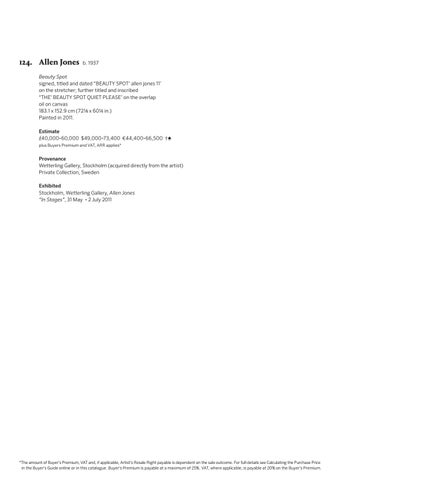 Beauty Spot signed, titled and dated “BEAUTY SPOT’ allen jones 11’ on the stretcher; further titled and inscribed “THE’ BEAUTY SPOT QUIET PLEASE’ on the overlap oil on canvas 183.1 x 152.9 cm (72 1/8 x 60 1/4 in.) Painted in 2011. Estimate £40,000-60,000 $49,000-73,400 €44,400-66,500 †♠ plus Buyers Premium and VAT, ARR applies*