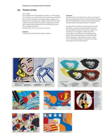 Literature Connie Lembark L78-L83 (Francis); Mary Lee Corlett 33 and 34 (Lichtenstsein); Richard Axsom and David Platzker 28.1-28.3 (Oldenberg); Constance Glenn 2 (Rosenquist); Frayda Feldman and Jörg Schellmann 5 (Warhol) Including: Pierre Alechinsky, Karel Appel, Enrico Baj, Alan Davie, Jim Dine, Öyvind Fahlström, Reinhoud d’Haese, Robert Indiana, Alfred Jensen, Asger Jorn, Allan Kaprow, Kiki Kogelnik, Alfred Leslie, Roy Lichtenstein, Joan Mitchell, Claes Oldenburg, Mel Ramos, Robert Rauschenberg, Jean-Paul Riopelle, James Rosenquist, Antonio Saura, Kimber Smith, K.R.H. Sonderborg, Walasse Ting, Bram van Velde, Andy Warhol and Tom Wesselmann