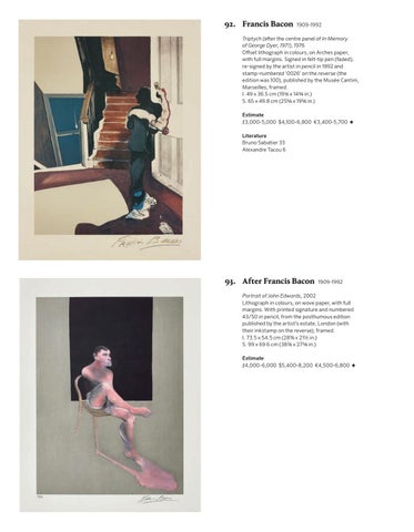 Triptych (afer the centre panel of In Memory of George Dyer, 1971), 1976 Ofset lithograph in colours, on Arches paper, with full margins. Signed in felt-tip pen (faded), re-signed by the artist in pencil in 1992 and stamp-numbered ‘0026’ on the reverse (the edition was 100), published by the Musée Cantini, Marseilles, framed. I. 49 x 36.5 cm (19 1/4 x 14 3/8 in.) S. 65 x 49.8 cm (25 5/8 x 19 5/8 in.) Estimate £3,000-5,000 $4,100-6,800 €3,400-5,700 ♠ Literature Bruno Sabatier 33 Alexandre Tacou 6