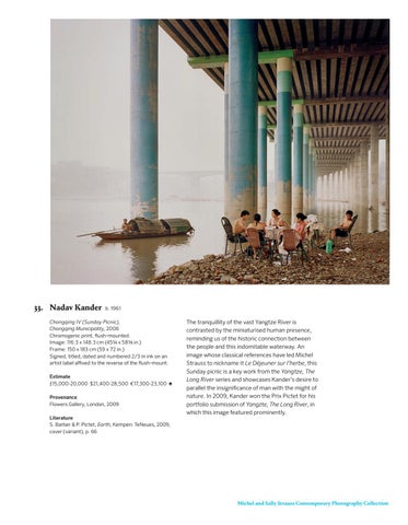 Chongqing IV (Sunday Picnic), Chongqing Municipality, 2006 Chromogenic print, fush-mounted. Image: 116.3 x 148.3 cm (45 3/4 x 58 3/8 in.) Frame: 150 x 183 cm (59 x 72 in.) Signed, titled, dated and numbered 2/3 in ink on an artist label afxed to the reverse of the fush-mount. Estimate £15,000-20,000 $21,400-28,500 €17,300-23,100 ♠ Provenance Flowers Gallery, London, 2009 Literature S. Barber & P. Pictet, Earth, Kempen: TeNeues, 2009, cover (variant), p. 66
