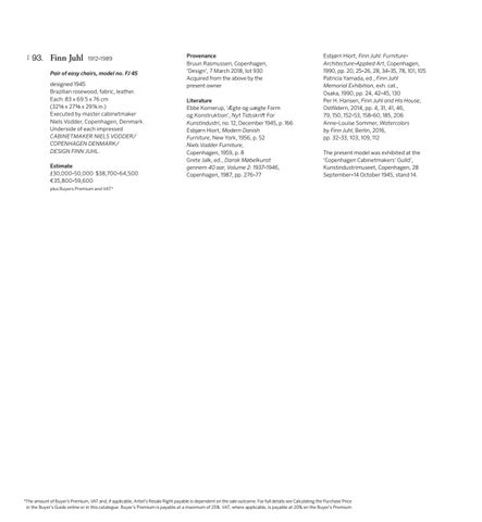 Esbjørn Hiort, Finn Juhl: FurnitureArchitecture-Applied Art, Copenhagen, 1990, pp. 20, 25-26, 28, 34-35, 78, 101, 105 Patricia Yamada, ed., Finn Juhl Memorial Exhibition, exh. cat., Osaka, 1990, pp. 24, 42-45, 130 Per H. Hansen, Finn Juhl and His House, Ostfldern, 2014, pp. 4, 31, 41, 46, 79, 150, 152-53, 158-60, 185, 206 Anne-Louise Sommer, Watercolors by Finn Juhl, Berlin, 2016, pp. 32-33, 103, 109, 112 The present model was exhibited at the ‘Copenhagen Cabinetmakers’ Guild’, Kunstindustrimuseet, Copenhagen, 28 September–14 October 1945, stand 14.