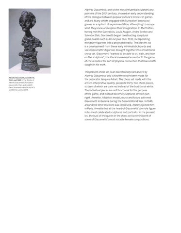 Alberto Giacometti, one of the most infuential sculptors and painters of the 20th century, showed an early understanding of the dialogue between popular culture’s interest in games and art. Many artists engaged with Surrealism embraced games as a system of experimentation, attempting to escape what they knew and explore their imagination. In the thirties, having met the Surrealists, Louis Aragon, Andre Breton and Salvador Dali, Giacometti began constructing sculptural game boards such as On ne joue plus, 1932, incorporating miniature fgurines into a projected reality. The present lot is a development from these early minimalistic boards and sees Giacometti’s fgurines brought together into a traditional chess set. Giacometti “wanted to be able to sit, walk, and lean on the sculpture”, the literal movement essential to the game of chess invites the sort of physical connection that Giacometti sought in his work.