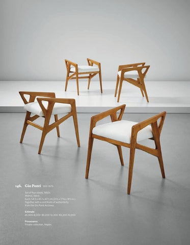Set of four stools, 1950s Walnut, fabric. Each: 54.5 x 45.1 x 47.1 cm (21 1/2 x 17 3/4 x 18 1/2 in.) Together with a certifcate of authenticity from the Gio Ponti Archives. Estimate £6,000-8,000 $9,200-12,300 ₏8,200-10,900 Provenance Private collection, Naples