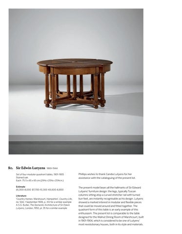 Set of four modular quadrant tables, 1901-1905 Stained oak. Each: 75.5 x 65 x 65 cm (29 3/4 x 25 5/8 x 25 5/8 in.) Estimate £6,000-8,000 $7,700-10,300 €6,600-8,800 Literature ‘Country Homes: Marshcourt, Hampshire’, Country Life, no. 504, 1 September 1906, p. 312 for a similar example A.S.G. Butler, The Domestic Architecture of Sir Edwin Lutyens, London, 1950, pl. 35 for a similar example