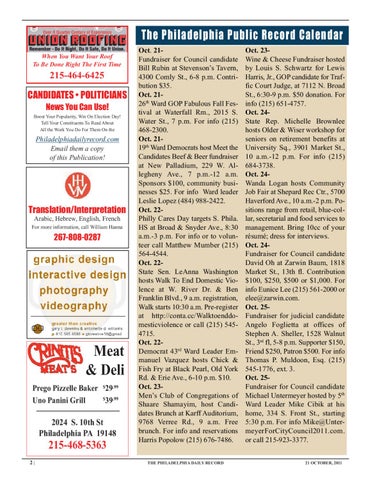 Oct. 21Fundraiser for Council candidate Bill Rubin at Stevenson’s Tavern, 4300 Comly St., 6-8 p.m. Contribution $35. Oct. 2126th Ward GOP Fabulous Fall Festival at Waterfall Rm., 2015 S. Water St., 7 p.m. For info (215) 468-2300. Oct. 2119th Ward Democrats host Meet the Candidates Beef & Beer fundraiser at New Palladium, 229 W. Allegheny Ave., 7 p.m.-12 a.m. Sponsors $100, community businesses $25. For info Ward leader Leslie Lopez (484) 988-2422. Oct. 22Philly Cares Day targets S. Phila. HS at Broad & Snyder Ave., 8:30 a.m.-3 p.m. For info or to volunteer call Matthew Mumber (215) 564-4544. Oct. 22State Sen. LeAnna Washington hosts Walk To End Domestic Violence at W. River Dr. & Ben Franklin Blvd., 9 a.m. registration, Walk starts 10:30 a.m. Pre-register at http://conta.cc/Walktoenddomesticviolence or call (215) 5454715. Oct. 22Democrat 43rd Ward Leader Emmanuel Vazquez hosts Chick & Fish Fry at Black Pearl, Old York Rd. & Erie Ave., 6-10 p.m. $10. Oct. 23Men’s Club of Congregations of Shaare Shamayim, host Candidates Brunch at Karff Auditorium, 9768 Verree Rd., 9 a.m. Free brunch. For info and reservations Harris Popolow (215) 676-7486. THE PHILADELPHIA DAILY RECORD