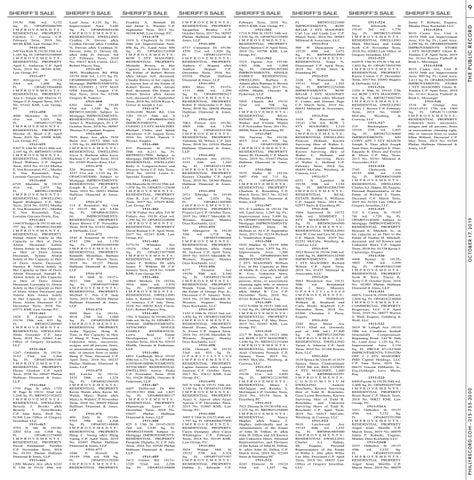 SHERIFF’S SALE Ft. BRT#332221000 IMPROVEMENTS: ROW B/GAR 2 STY MASONRY Carl Lee and Linda Lee C.P. March Term, 2016 No. 00983 Milstead & Associates, LLC 1911-514 500 W Duncannon Ave 19120 49th wd. 2,072 Sq. Ft. BRT#492018900 I M P R O V E M E N T S : RESIDENTIAL Sonja N. Drummond C.P. April Term, 2019 No. 02388 Stern & Eisenberg PC 1911-515 2108 N Wanamaker St 19131 52nd wd. 1,293 Sq. Ft. BRT#522234300 IMPROVEMENTS: ROW B/GAR 2 STY MASONRY Michael Coates a/k/a Michael F. Coates and Deneen Page C.P. March Term, 2019 No. 00632 Milstead & Associates, LLC 1911-516 1618 W Ruscomb St 19141 17th wd. ROW 2 STY MASONRY; 1,710 Sq. Ft. BRT#171044500 I M P R O V E M E N T S : RESIDENTIAL DWELLING Princess Holland, Known Surviving Heir of Walter L. Holland, Ronald Holland, Known Surviving Heir of Walter L. Holland, and Unknown Surviving Heirs of Walter L. Holland C.P. February Term, 2018 No. 00459 McCabe, Weisberg, & Conway, LLC 1911-517 6551 N Lambert St 19138 10th wd. 1,134 Sq. Ft. BRT#102083700 I M P R O V E M E N T S : RESIDENTIAL REAL ESTATE Bobbie E. Williams C.P. August Term, 2018 No. 02977 Stern & Eisenberg PC 1911-518 1904 Stanwood St 19152 56th wd. SEMI/DET 2 STY MASONRY; 1,512 Sq. Ft. BRT#562044500 I M P R O V E M E N T S : RESIDENTIAL DWELLING Jose W. Cruz and Lisa M. Cruz C.P. March Term, 2019 No. 02252 McCabe, Weisberg, & Conway, LLC 1911-519 3923 Brown St 19104 24th wd. 1,600 Sq. Ft. BRT#243122500 IMPROVEMENTS: ROW 3 STY MASONRY Richard Wilson C.P. April Term, 2018 No. 01435 Milstead & Associates, LLC 1911-520 5963 Woodcrest Ave 19131 50th wd. Residential Row 2 Story Masonry O P A # 5 2 2 1 6 5 0 0 0 I M P R O V E M E N T S : ERECTED THEREON William K. Bradwell and Carla Hooks Bradwell C.P. December Term, 2018 No. 03300 Christina J. Pross, Esquire 1911-521 2285 Bryn Mawr Ave 19131 52nd wd. (formerly part of 34th wd.) 37,500 Sq. Ft. BRT#521266700 I M P R O V E M E N T S : RESIDENTIAL DWELLING Tarani A. Johnson C.P. April Term, 2010 No. 01188 Powers Kirn, LLC 1911-522 1619 Spruce St, Unit #1 of 1619 Spruce Street Condominium 19103 8th wd. RES CONDO 4 STY MASONRY; 1,000 Sq. Ft. BRT#888103291 I M P R O V E M E N T S : C O N D O M I N I U M DWELLING Andrew Boschetto, Known Surviving Heir of Todd R. Boschetto, Gaye Lynne Boschetto, Known Surviving Heir of Todd R. Boschetto, and Unknown Surviving Heirs of Todd R. Boschetto C.P. April Term, 2019 No. 04313 McCabe, Weisberg, & Conway, LLC 1911-523 5610 Larchwood Ave 19143 46th wd. 1,232 Sq. Ft. BRT#463005400 I M P R O V E M E N T S : RESIDENTIAL DWELLING Charles A.J. Halpin, III, Esquire, Personal Representative of the Estate of Willie L. Irby a/k/a Willie Lee Irby, Deceased C.P. April Term, 2018 No. 00653 Law Office of Gregory Javardian, LLC