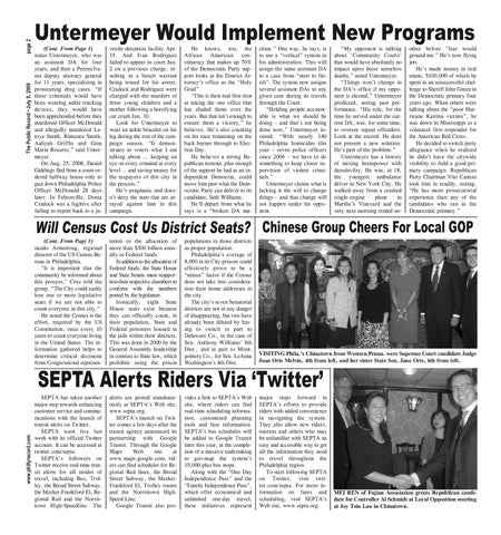 Untermeyer Would Implement New Programs (Cont. From Page 1) states Untermeyer, who was an assistant DA for four years, and then a Pennsylvania deputy attorney general for 11 years, specializing in prosecuting drug cases. “If these criminals would have been wearing ankle tracking devices, they would have been apprehended before they murdered Officer McDonald and allegedly murdered Latoya Smith, Rimanee Smith, Aaliyah Griffin and Gina Marie Rosario,” said Untermeyer. On Aug. 25, 2008, Daniel Giddings fled from a court-ordered halfway house only to gun down Philadelphia Police Officer McDonald 28 days later. In Feltonville, Donta Cradock was a fugitive after failing to report back to a ju-