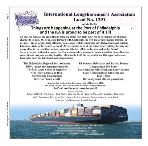 Things are happening at the Port of Philadelphia and the ILA is proud to be part of it all! No one can miss all the great things going on at the Port right now: we’re deepening our shipping channel to 45 feet. We’re moving forward with Southport, the first major new marine terminal in decades. We’re aggressively attracting new cargoes while continuing our dedication to our existing business. And, we here, at ILA Local 1291 are proud to be at the center of everything, helping our many allies in the maritime industry to make this Port all it can be now and in the future! So, as we make continued progress, the ILA wants to take a moment to thank and salute those allies, because without everyone working together, all would be lost! So, we want to use this opportunity to acknowledge these fine individuals and organizations: