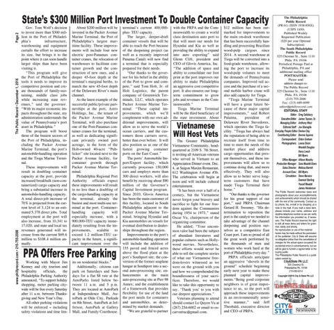 Vietnamese Will Host Vets The Greater Philadelphia Vietnamese Community, headquartered at 2109 S. 7th Street, is inviting all American veterans who served in Vietnam to an Appreciation Dinner event, Dec. 4, at Saigon Maxim Restaurant, 612 Washington Avenue #3b. The celebration will begin at noon and will include cultural entertainment. “It has been over a half of a century, but the Vietnamese never forgot your bravery and sacrifice to fight for our freedom against the Communists during 1954 to 1973,” stated Oscar Vu, chairperson of the organizing committee. He added, “Your uncommon valor had been the subject of abundant literatures and popular cultures such as Hollywood movies. Nevertheless, these efforts would never be able to tell the complete stories of what our Vietnamese freedom-lovers witnessed as we were on the ground with you and how we comprehended the boundlessness of your sacrifices. Therefore, we would like to take this opportunity to say, ‘Thank you’ to you with our deepest appreciations.” Veterans planning to attend should contact Le Quyen Vu at (267) 254-6002 or email to oscarvutruc@gmail.com.