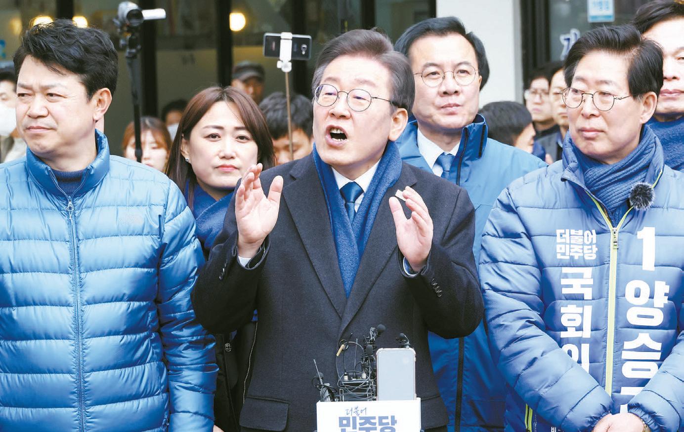 한동훈 국민의힘 비상대책위원장이 지난 8일 경기 성남시 금호행복시장을 방문해 지지자들에게 호 소하고 있다. 성남=이한호 기자 이재명 더불어민주당 대표가 11일 충남 홍성군 홍성시장을 방문해 지지자들에게 호소하고 있다. 홍성=최주연 기자 與 성남, 野 홍성 지지 호소