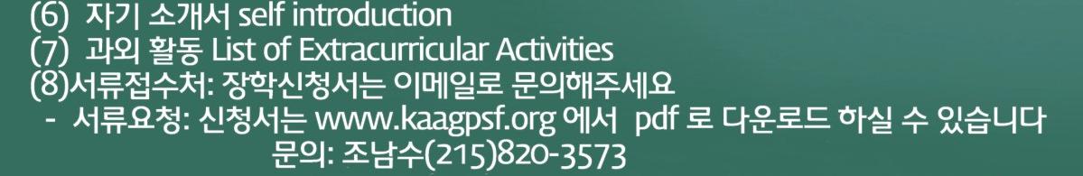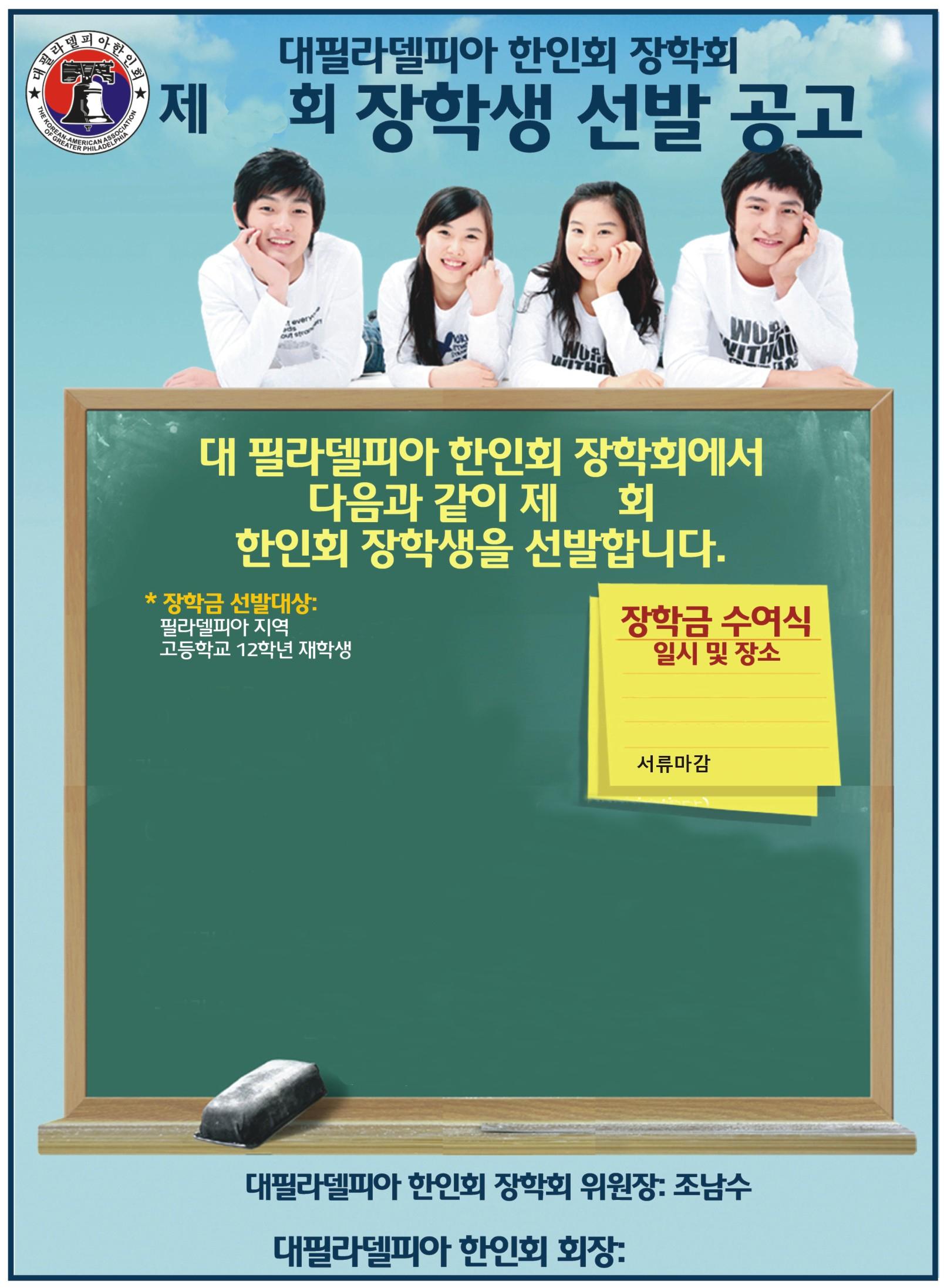 B6 2023년 9월 20일 수요일 전면광고 23 23 2023.10.28,7pm 202310.07 (9월 2023년 현재) 대학생 1~4학년 재학생 (타주 학교를 다녀도 부모가 남부 뉴저지, 필라지역 거주면 해당됨) (대학생 제외) 장소 미정 장학고문: 이귀옥 / 장학위원: 최유아 강소영 전수잔 조남수 심수목 제임스 김 이승훈 cnamsoo0815@gmail.com