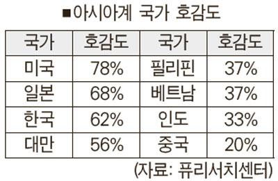 아시안 아메리칸의 아시아 국가 호 감도에서는 한국과 일본이 60% 이상 을 기록해 최상위로 나타났고, 이어 대만 56%, 필리핀과 베트남 각각 37%, 인도 33%, 중국 20% 등의 순으로 조 사됐다. 미국과 중국 간 갈등이 고조 되면서 아시안 아메리칸 역시 중국에 대한 부정적 인식이 높아졌음을 시사 한다.