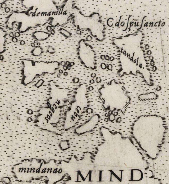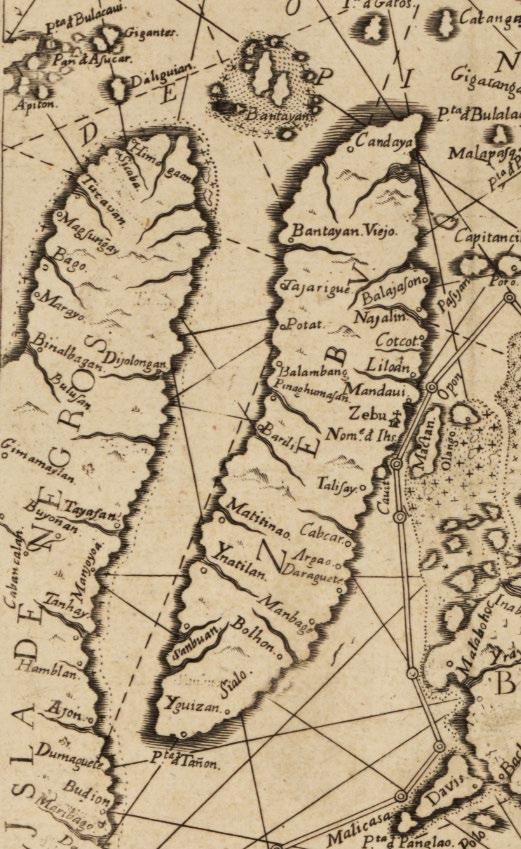 The explanation is provided by an untitled, c.1665 manuscript map of Luzon and the Visayas produced by Johannes Vinckeboons for the Dutch Vereenigde Oost Indische Compagnie (VOC). This map, which was copied by François Valentijn in 1724 and (as Nieuwe Afteekening van de Philippynse Eylenden) by Johannes II van Keulen in 1753, gives the island the novel name of Celo and shows the toponym Nombre [de] Dios on the southeast coast. This name for the city of Cebu was derived from its Spanish name: ‘La Ciudad del Santisimo Nombre de Jésus’ (see ‘Cebu City: A Cartographic Chronicle’ on page 21).