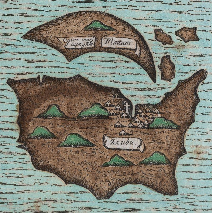 Detail of ‘Mattam’ and ‘Zzubu’ from Antonio Pigafetta’s map c.1525 (image courtesy of the Beinecke Rare Book and Manuscript Library, Yale University)