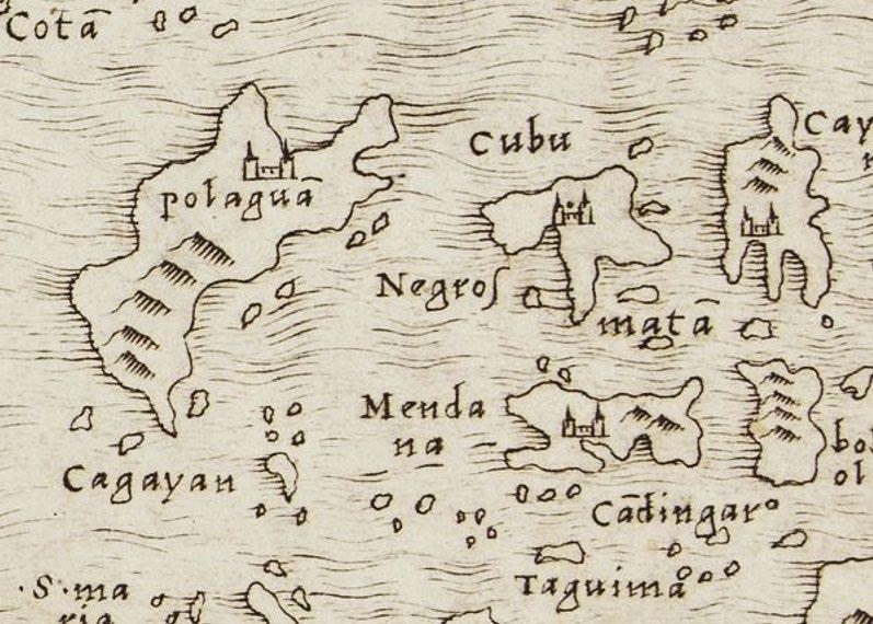 Some of the earliest European maps to show the Philippines are manuscript portolan charts by Iberian navigators, and early maps of Asia were also published in Italy. The ‘Carta Castiglioni’ of c.1525, attributed to Diogo Ribeira, shows Cebu as Çubu, as does the ‘Legazpi map’ attributed to Pierres Pli (aka Pierre Plin), a pilot in the Legazpi armada of 1564 65. The maps India Tercera Nuova Tabula by Girolamo Ruscelli (1561) and Descripcion delas Yndias del Poniente by Juan López de Velasco (1575, copied by Antonio de Herrera y Tordesillas in 1601) use Cubu, without the cedilla. Gaspar Viegas opted for Çubo in his c.1537 chart of the western part of the Pacific Ocean, and the Costa de Cubo is shown by Fernão Vaz Dourado in the portolan atlases he produced between 1550 and 1575.
