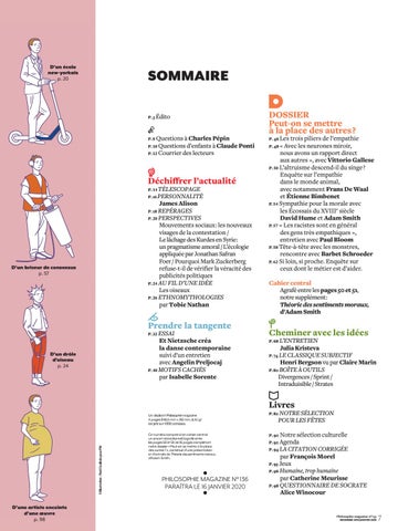 nous avons un rapport direct aux autres », avec Vittorio Gallese P. 50 L’altruisme descend-il du singe ? Enquête sur l’empathie dans le monde animal, avec notamment Frans De Waal et Étienne Bimbenet P. 54 Sympathie pour la morale avec les Écossais du XVIIIe siècle David Hume et Adam Smith P. 57 « Les racistes sont en général des gens très empathiques », entretien avec Paul Bloom P. 58 Tête-à-tête avec les monstres, rencontre avec Barbet Schroeder P. 62 Si loin, si proche. Enquête sur ceux dont le métier est d’aider.