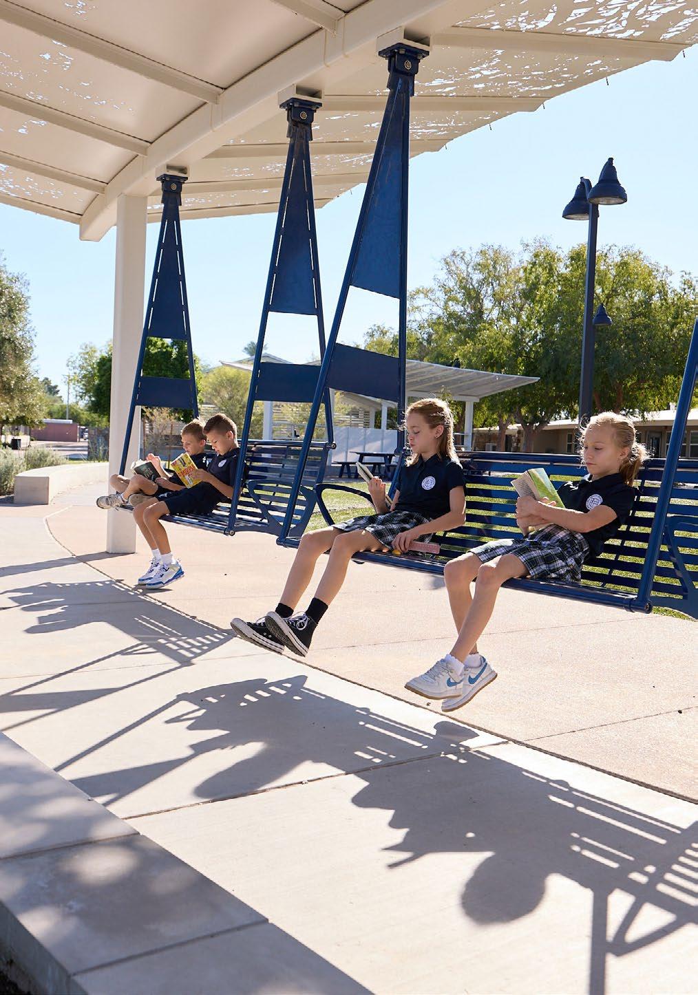 Our 15-acre campus feels like a green oasis in the heart of North Central Phoenix, with green spaces, shaded walkways, and mature trees that create a calm, inviting environment for learning. The design of our campus allows students to move fluidly between indoor and outdoor spaces throughout the day: classrooms open onto terraces for small group work, outdoor pavilions double as gathering spaces, and common areas invite collaboration, community-building, and reflection. The environment itself becomes part of the learning experience.