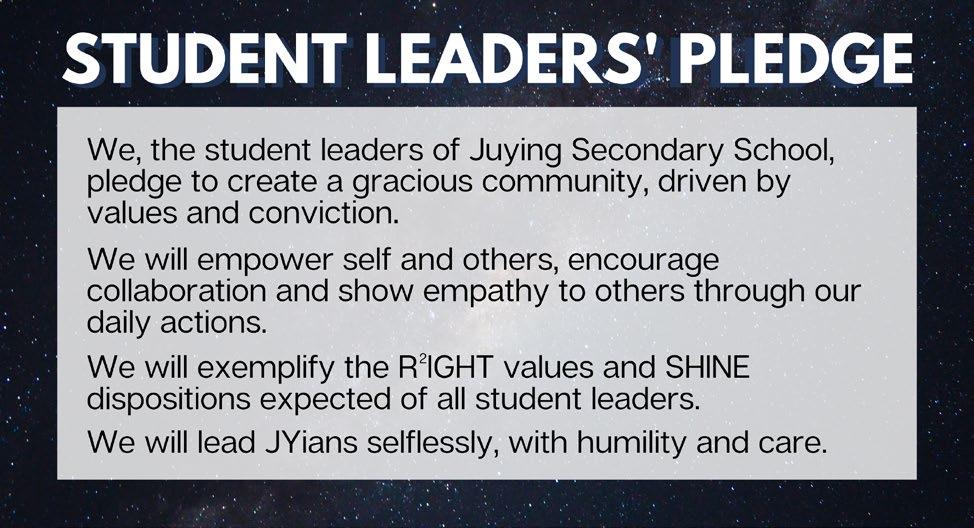 Juying Student Council (JYSC) develops student leaders who will uphold and embody Juying’s R2IGHT school values. As the apex of student leadership in the school, Student Councillors are the leaders of leaders, who lead the way for the student body through example. JYSC prides itself on being wholly student-run; Student Councillors are given full autonomy in the design of student-led programmes in the school.