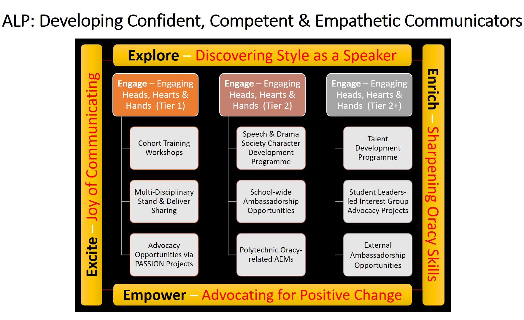 Our Applied Learning Programme (ALP) in Oracy aims to ‘Develop Confident, Competent and Empathetic Communicators’. Our ALP has a holistic framework that focuses on the 5Es ‘Engage, Excite, Explore, Enrich and Empower’. All our Engage programmes aim to Excite all JYians to have the joy of communicating, allow them to Explore and discover their style as a speaker, Enrich them by sharpening their oracy skills and Empower them to advocate for positive changes, be it in school or in the community.