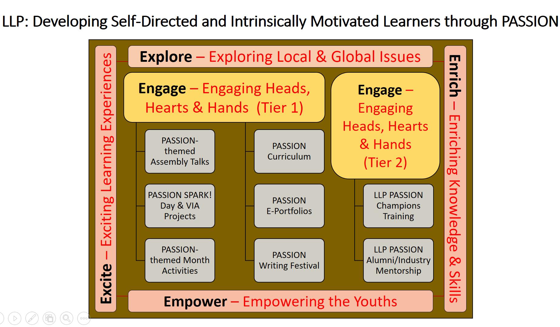 The Tier 1 LLP programmes, which target at all the students in each cohort, include the PASSIONthemed Assembly Talks, PASSION curriculum and PASSION SPARK! Day and VIA Projects, which JYians from lower secondary and upper secondary respectively have to ideate in teams to come up with to showcase their learning and advocate for what they are passionate for.