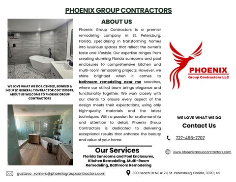 Phoenix Group Contractors is a renowned remodeling company nestled in the heart of St. Petersburg, Florida. Our commitment to excellence shines through our comprehensive remodeling services, tailored to breathe new life into homes throughout the region. We take pride in our ability to transform living spaces into stunning environments that reflect the unique preferences and lifestyles of each client. One of our most sought-after services is bathroom remodeling in St Petersburg Florida. We believe bathrooms should be both functional and personal havens, providing comfort and luxury in equal measure. Our meticulous approach ensures that from the initial design phase to the final polish, every detail caters to your vision for a serene retreat within your home. Additionally, we are at the forefront of crafting exquisite Florida Sunrooms and Pool Enclosures, allowing homeowners to enjoy the beauty of St. Petersburg's climate all year round. These spaces become bright focal points for relaxation and entertainment while also adding substantial value to your property. Address: 300 Beach Dr NE # 211, St. Petersburg, Florida, 33701 Company Phone: 727-496-7707 company Email: gustavo_romero@phoenixgroupcontractors.com Company Hours: Monday to Friday : 07:00 - 18:00 Saturday : 07:00 - 16:00