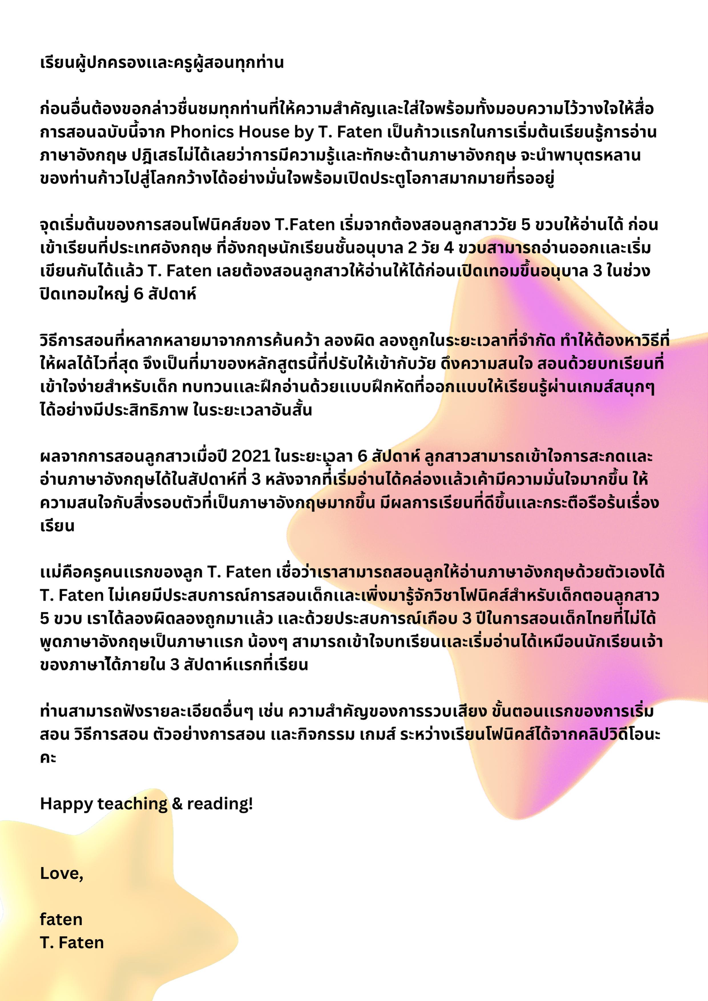 หนังสือฝึกอ่านโฟนิคส์พื้นฐานสำหรับน้องๆ ที่ผู้ปกครองตั้งใจสอนเองที่บ้าน เนื้อหาจากหนังสือเล่มนี้ปรับมาจากคอร์สออนไลน์ที่ T.Faten สอนทาง Phonics House ในตลอดระยะเวลา 3 ปี