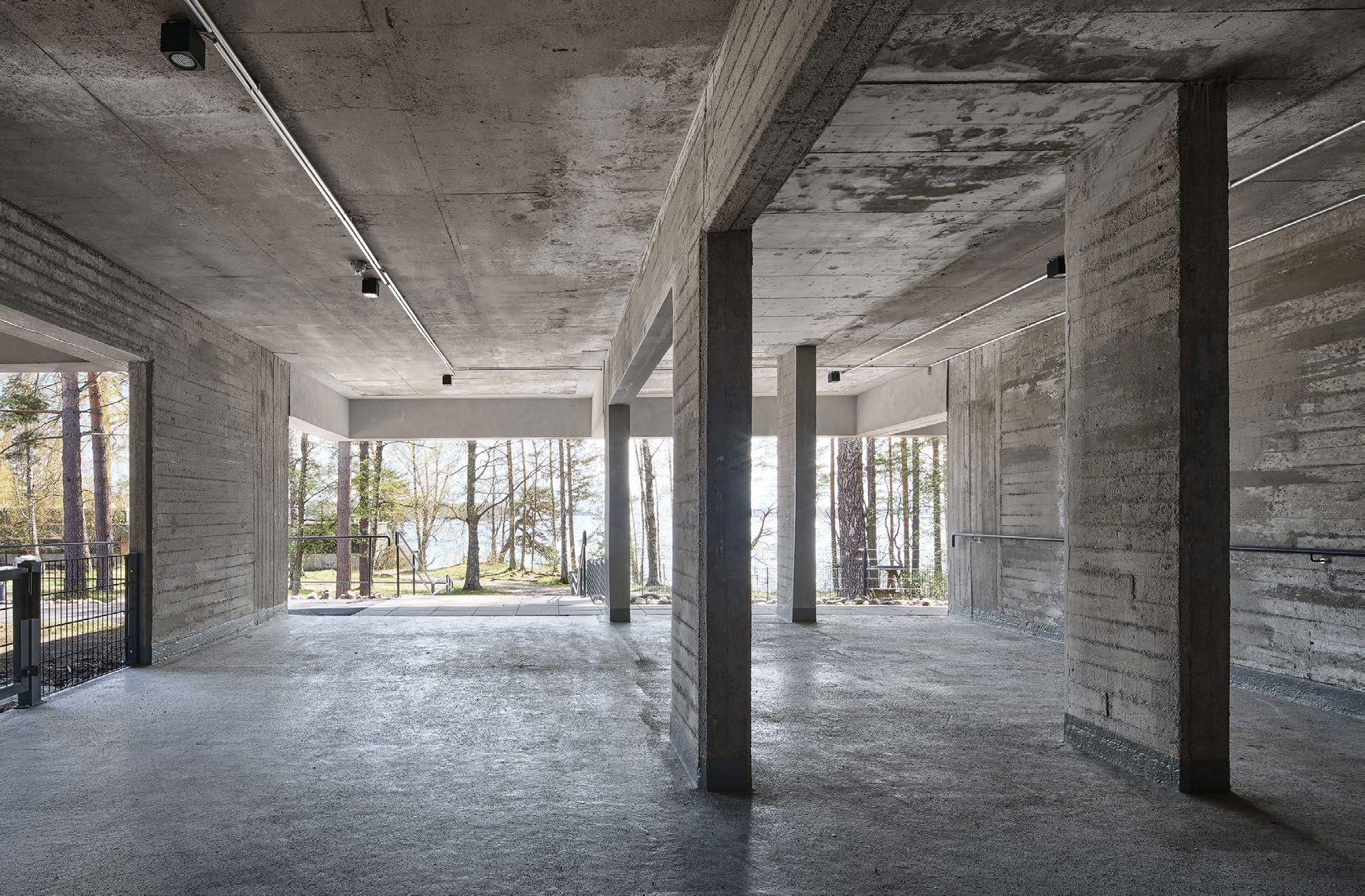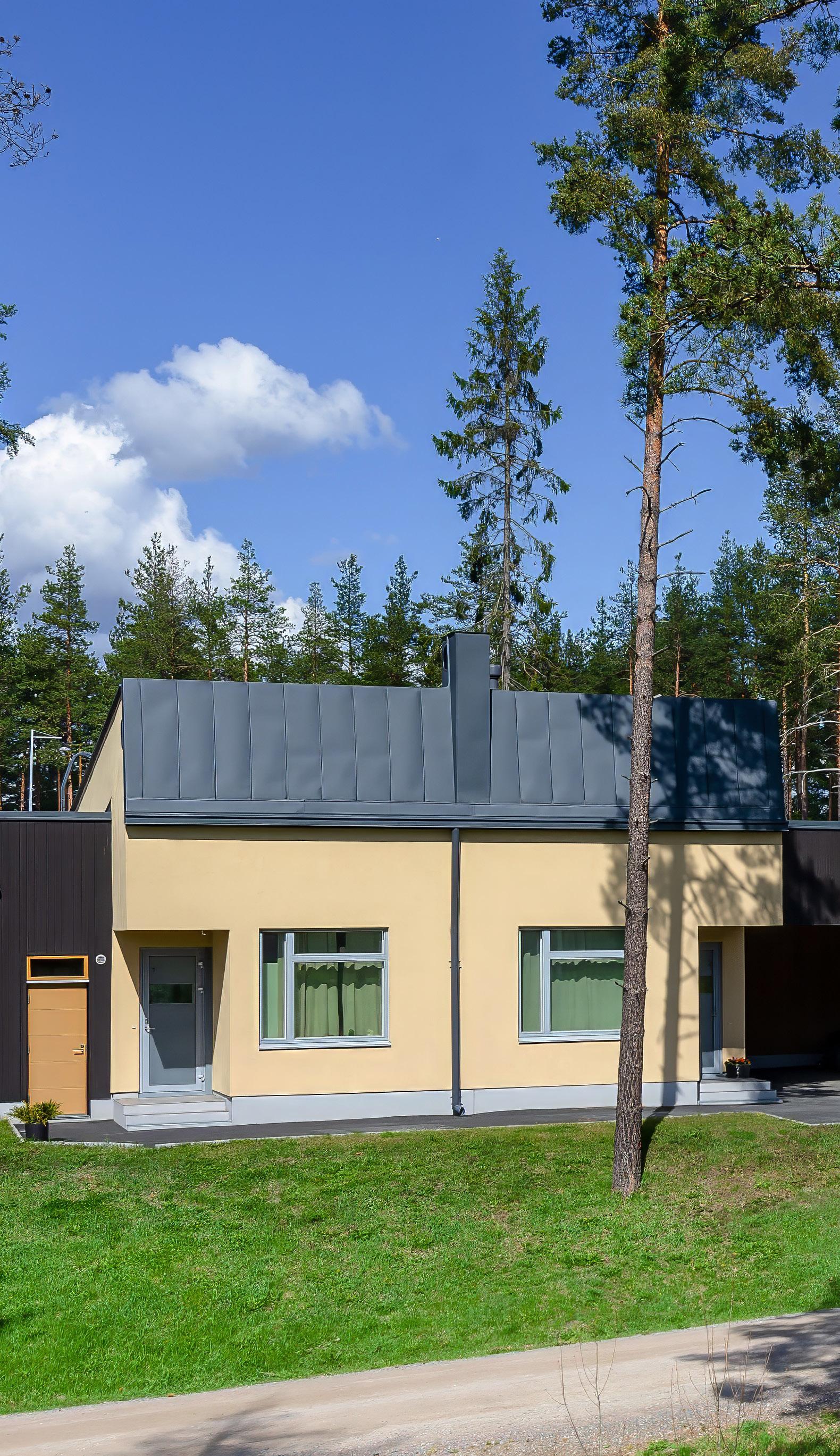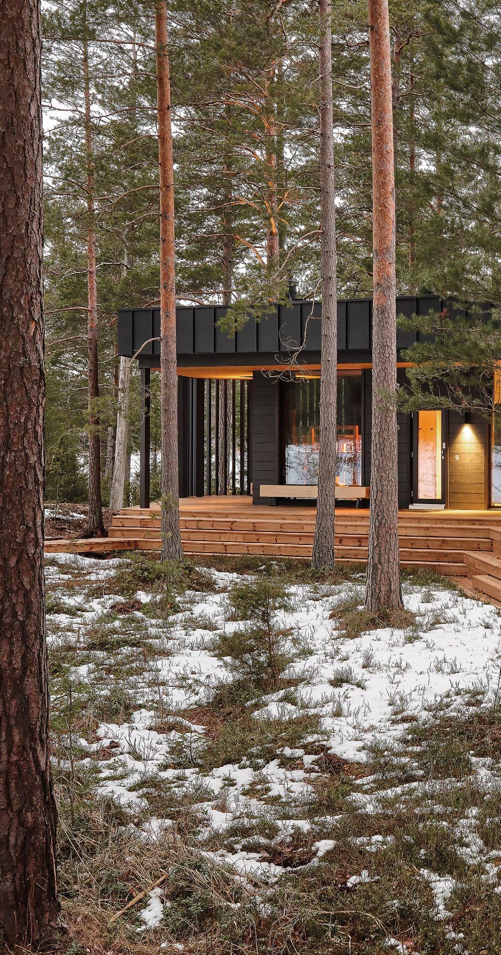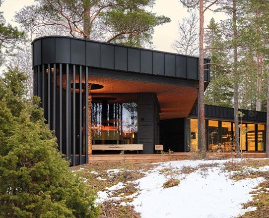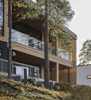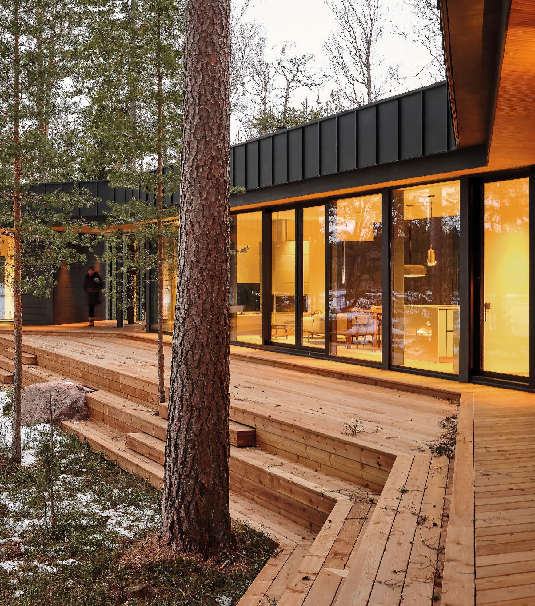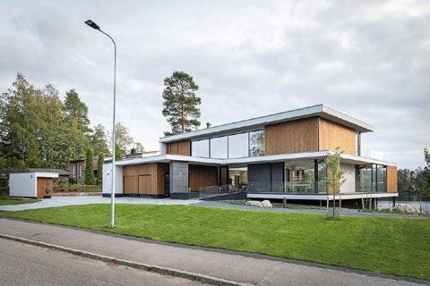 rento, joka laskeutuu metsäaukiolle. Sisustus on valoisa ja avara. Ikkunat ja terassit avautuvat puutarhaan tai merelle, kun taas naapuritonttien puoleiset massiivipuuseinät tuovat yksityisyyttä. Päärakennusmateriaali on puu. Julkisivut on päällystetty kuusipaneeleilla ja -säleillä, sisätiloissa on saarnikatto ja parkettilattia. Mustat ikkunapuitteet ja viiluseinät luovat kontrastin puunsävyille. Taidetta ja designia asiakkaan kokoelmista on esillä kaikkialla. (03)