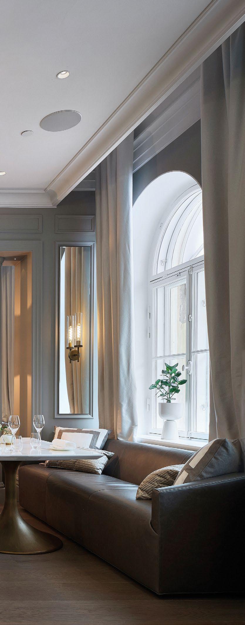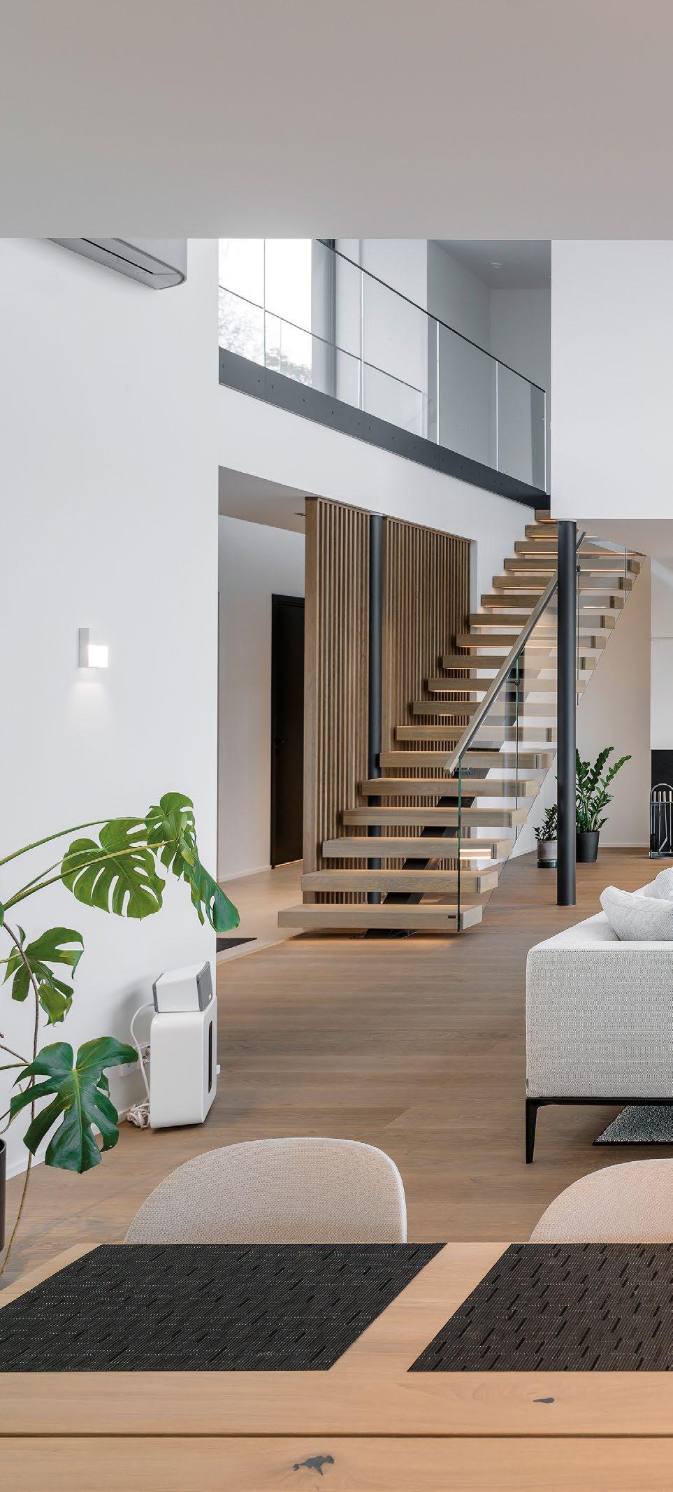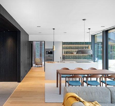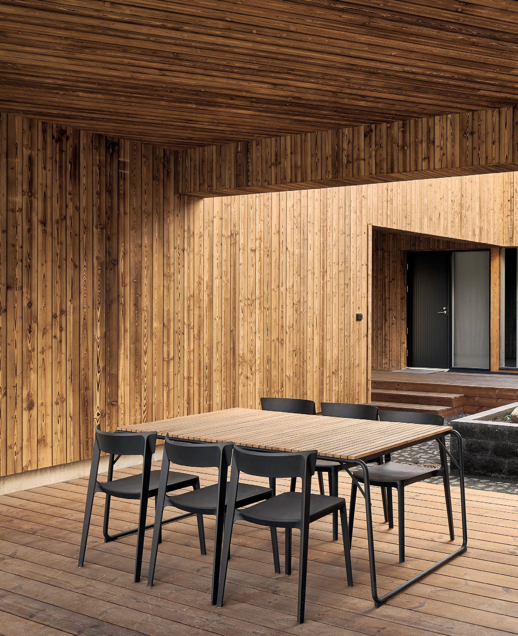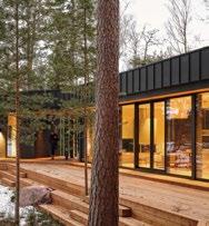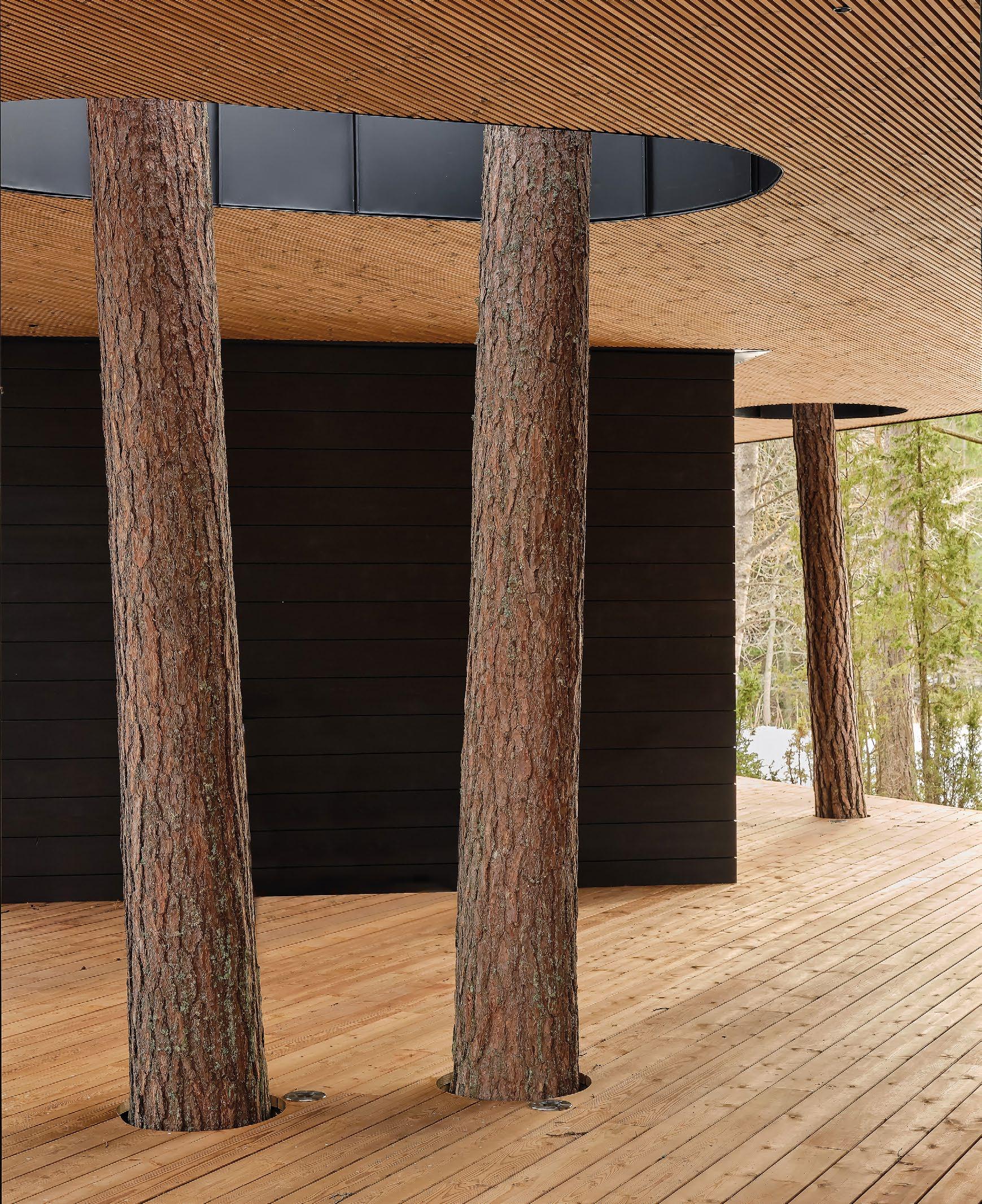 rento, joka laskeutuu metsäaukiolle. Sisustus on valoisa ja avara. Ikkunat ja terassit avautuvat puutarhaan tai merelle, kun taas naapuritonttien puoleiset massiivipuuseinät tuovat yksityisyyttä. Päärakennusmateriaali on puu. Julkisivut on päällystetty kuusipaneeleilla ja -säleillä, sisätiloissa on saarnikatto ja parkettilattia. Mustat ikkunapuitteet ja viiluseinät luovat kontrastin puunsävyille. Taidetta ja designia asiakkaan kokoelmista on esillä kaikkialla. (03)